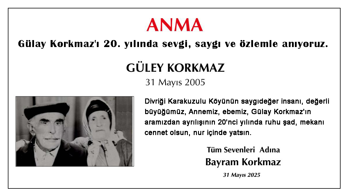 Divriği Karakuzulu Köyünün saygıdeğer insanı, değerli büyüğümüz, Annemiz, ebemiz, Gülay Korkmaz’ın aramızdan ayrılışının 20’nci yılında ruhu şad, mekanı cennet olsun, nur içinde yatsın.